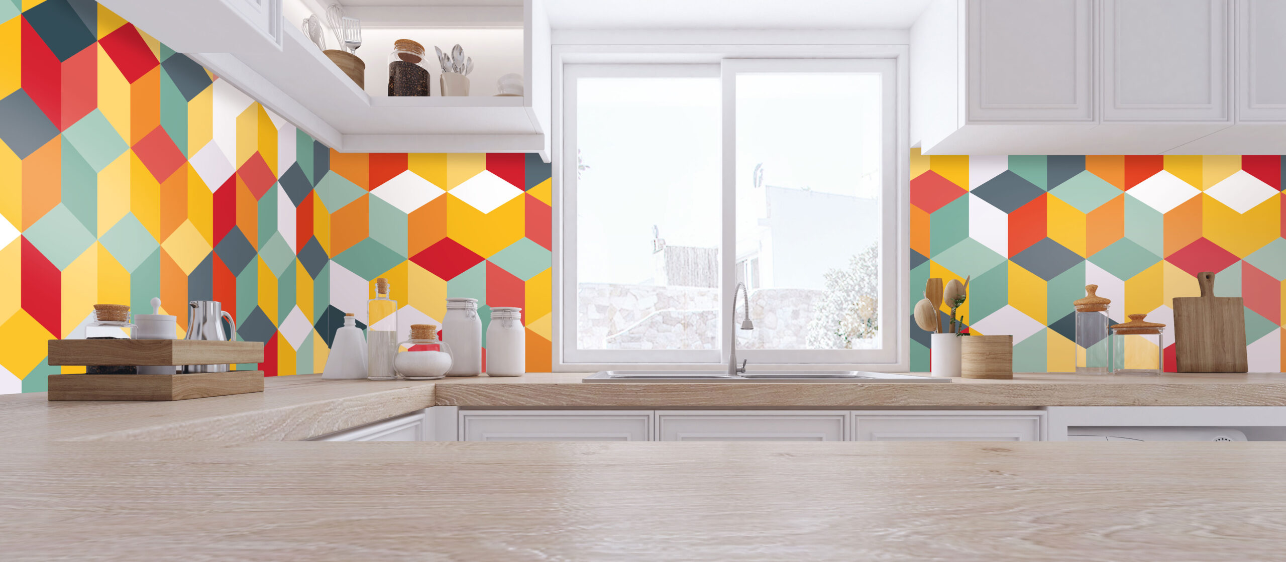 Crédence ‘Graphique’ : Géométrie Colorée pour une Cuisine Moderne!